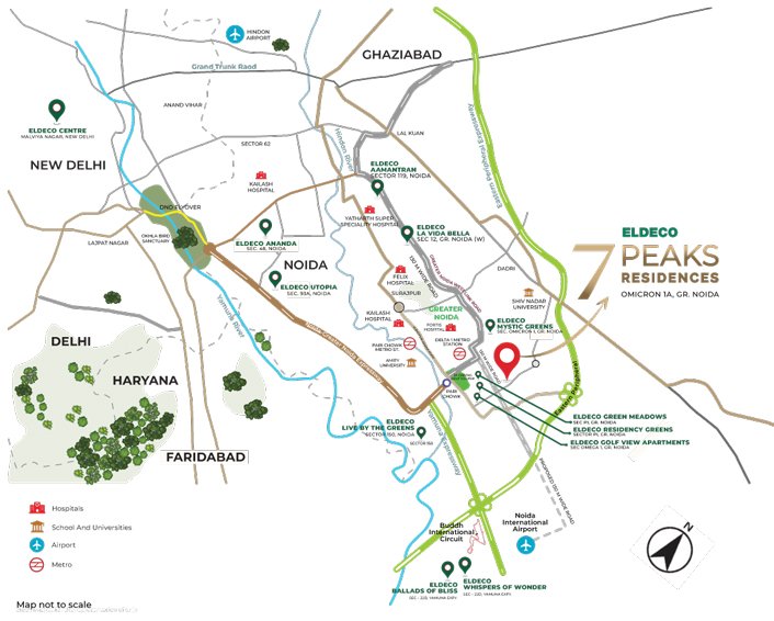 Prime Location Advantage: Eldeco 7 Peaks Residences is strategically located in Sector Omicron 1A, Greater Noida, a fast-growing residential hub with excellent infrastructure development. The project enjoys seamless connectivity to major destinations through the Noida–Greater Noida Link Road, ensuring smooth travel across NCR.